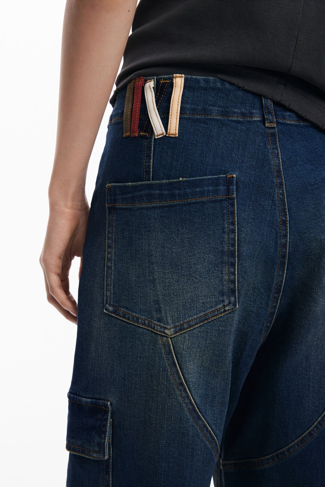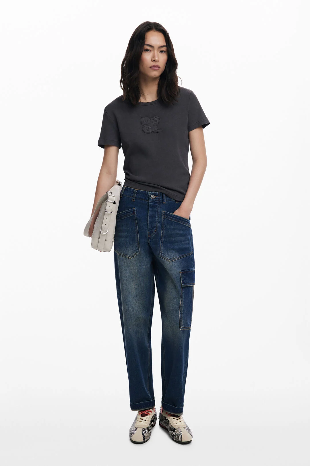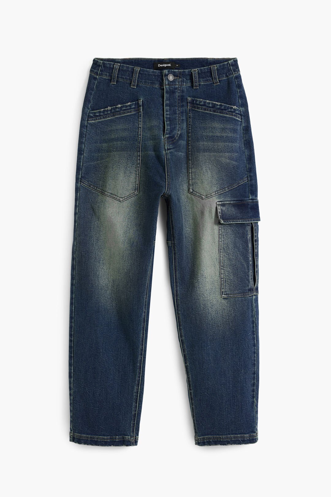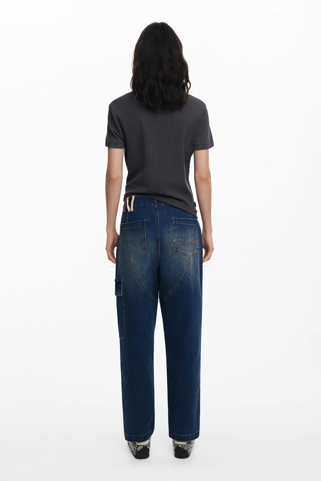 Μακρύ τζιν παντελόνι σε γραμμή Baggy, με εφέ πλυσίματος και τσέπες στα μπατζάκια και λεπτομέρειες από θηλιές σε εφέ δέρματος.