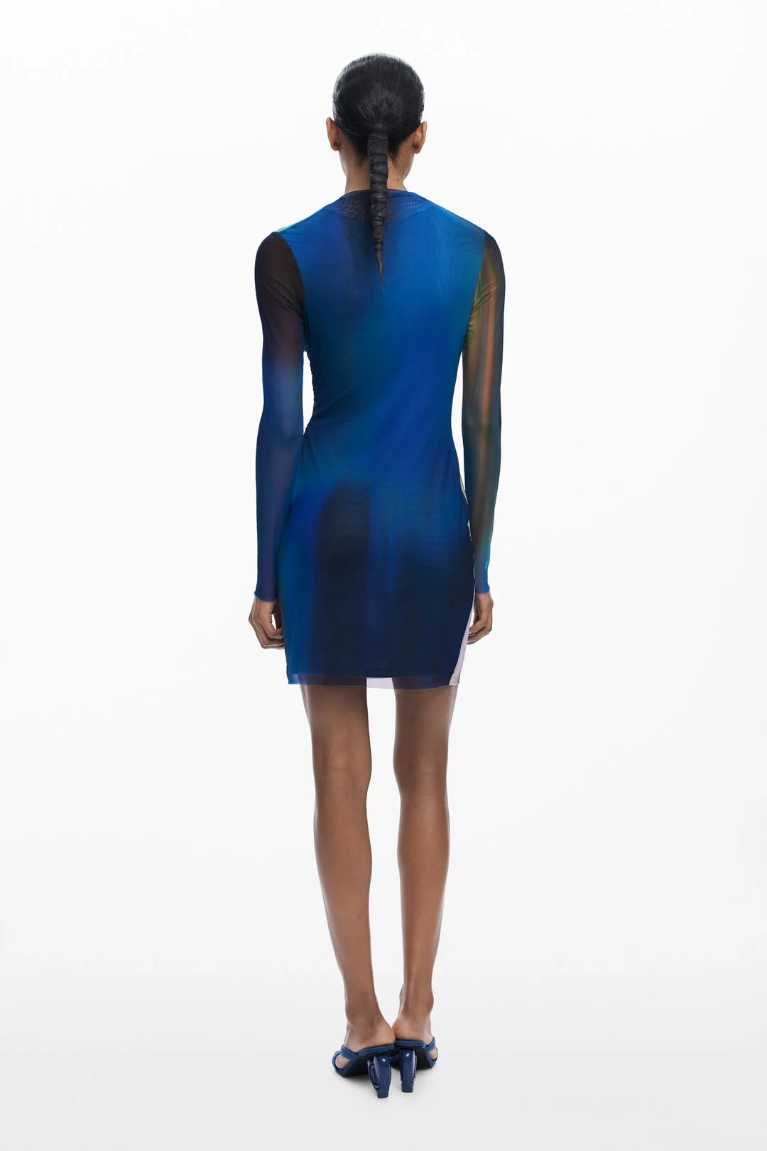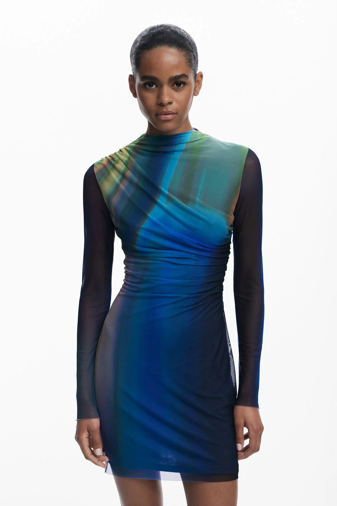 Κοντό φόρεμα από τούλι, με μακριά μανίκια, ελαφρώς ανασηκωμένο γιακά, ντραπέ μπροστά και ντεγκραντέ σε αποχρώσεις του μπλε.