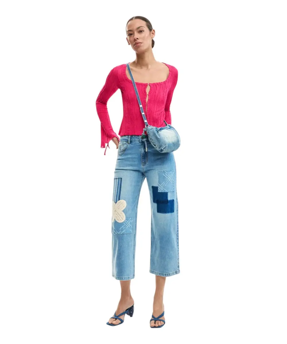 Το γυναικείο τζιν παντελόνι Leto της Desigual από τη συλλογή SS26 αποτελεί μια ωδή στην τεχνική του patchwork, συνδυάζοντας την urban κουλτούρα της Βαρκελώνης με την καλλιτεχνική έκφραση. Σε γραμμή culotte και με εντυπωσιακές εφαρμογές από διαφορετικά υφάσματα και prints, αυτό το παντελόνι μετατρέπει το κλασικό denim σε ένα statement κομμάτι υψηλής αισθητικής.